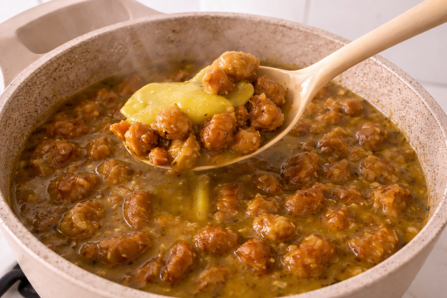 Voeg water toe en meng goed om klontjes te voorkomen. Laat dit ongeveer 30 minuten zachtjes koken.