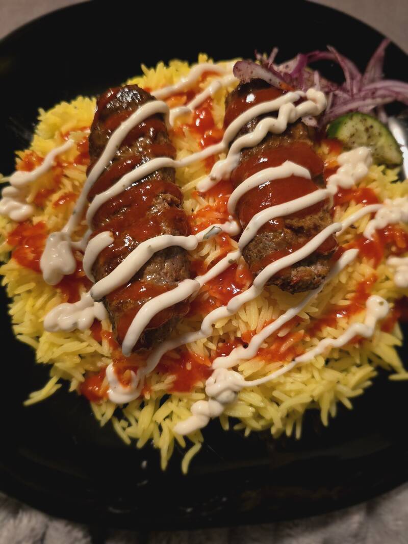 Schep je rijst in een bord met 3 stukjes kebab, de komkommer en ui salade.