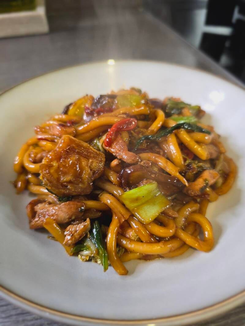 - Voeg vervolgens de udon noodles en woksaus toe.