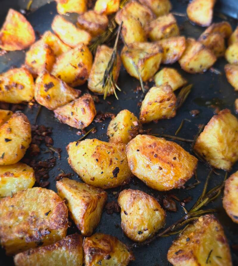 - Na 25 minuten draai je de aardappelen om en bak je ze nog eens 20 tot 30 minuten tot ze goudbruin en krokant zijn.