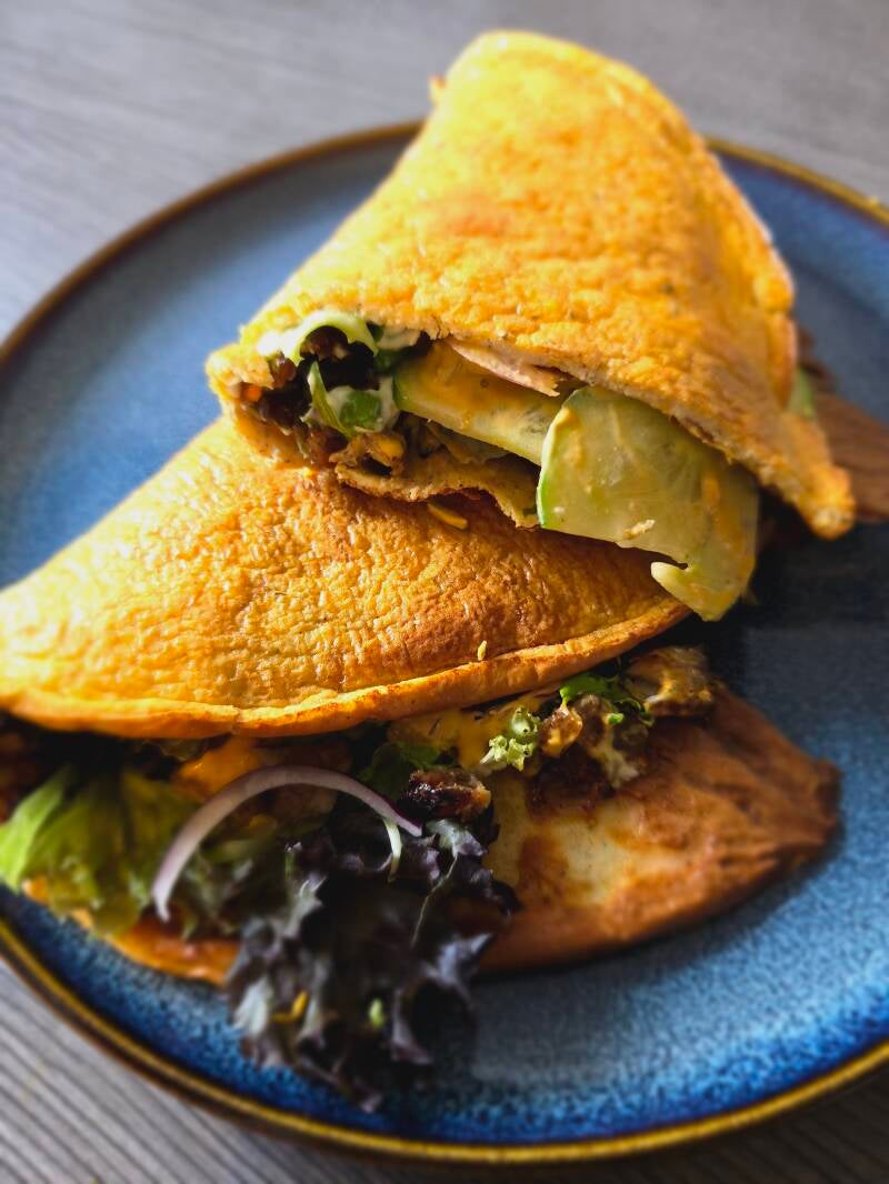 Haal de wrap uit de oven en laat het iets afkoelen. Beleg de wrap met mayo, sla, kip, komkommer, ui en een pittige saus naar keuze.